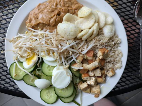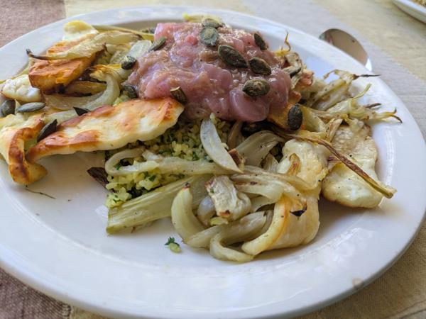 Gegrilde halloumi en venkel met kruidenbulgur en rabarber-sjalotcompote