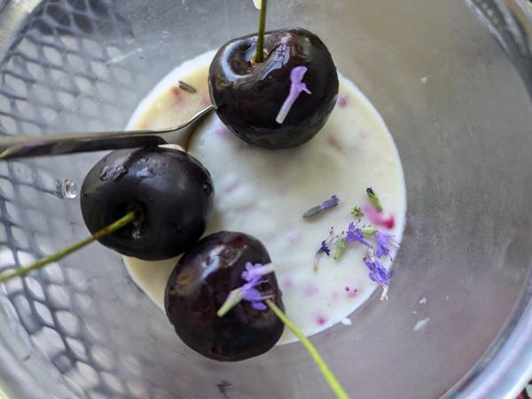 Witte chocolademousse met zijdentofu en seizoensfruit